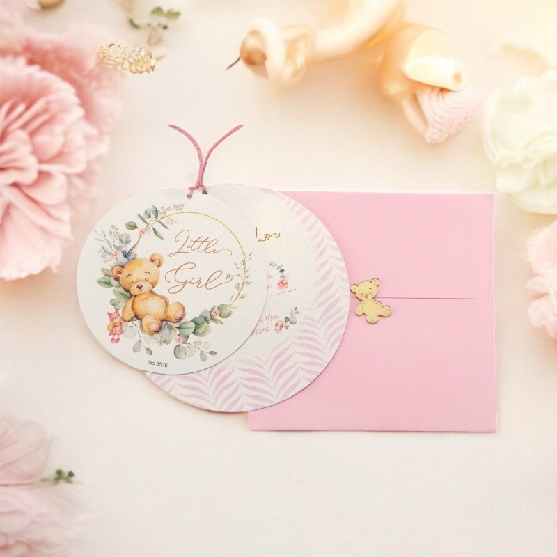 Προσκλητήριο αρκουδάκι κορίτσι, με τυπωμένο φάκελο και στις δύο όψεις, με ζωντανά χρώματα και υπέροχες αναπαραστάσεις!